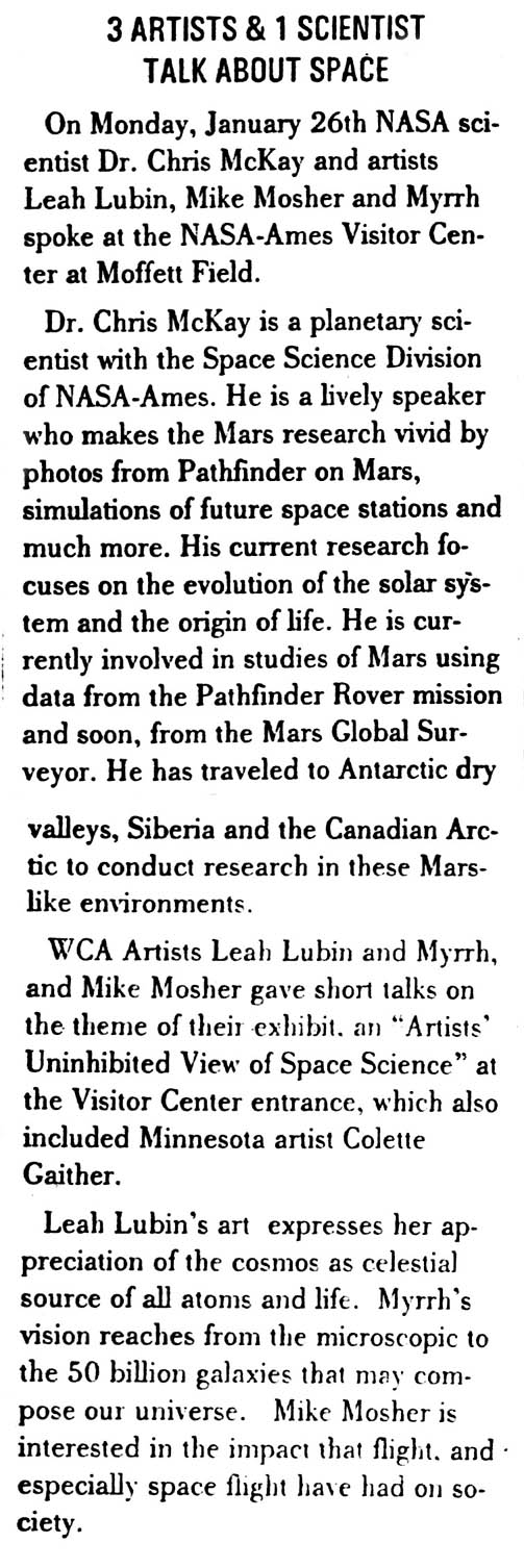 General Information - Exhibit Press Release - "A Scientist and 3 Artists Talk About Space" Press Release - "3 Artists and 1 Scientist Talk About Space", Ylem Magazine Pictures Of Exhibit Pictures Of Artwork Essays - The Artist And The Cosmos - I Paint The Cosmos - Leonardo Electronic Almanac Articles